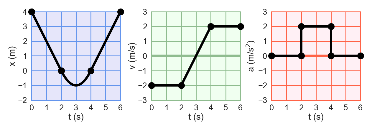 Draw the missing curves, with black dots in the same instants in time as in the given curve. All curved lines are parabolas.