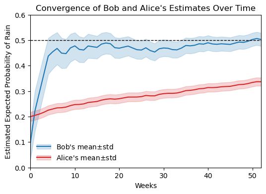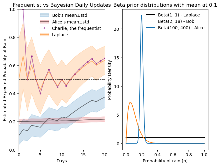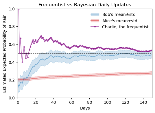 - In the following days, Charlie’s estimate fluctuates more wildly than Bob’s and Alice’s, especially in the early weeks when the amount of data is still small. As more data is collected, Charlie’s estimate stabilizes and converges towards the true probability of rain (50%).