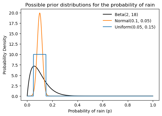 The prior in the Bayesian framework is not a single value. From the question above, we might think that our friend’s prior belief about the probability of rain is simply 0.1=10\%. However, in Bayesian statistics, the prior is represented as a probability distribution over all possible values of p. In would make sense to choose a probability distribution that is highest around 0.1 and lower elsewhere. There are infinite possible distributions that could represent this belief, so which should we choose? See below three examples of possible prior distributions, all have their mean at 0.1.
