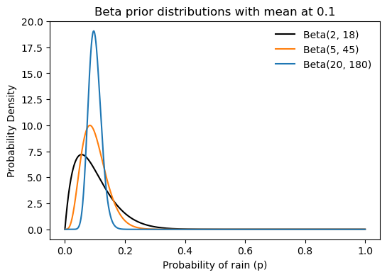 Instead of choosing \alpha=2 and \beta=18, we could choose other values that maintain the same mean but represent different levels of confidence or prior knowledge. See the three Beta distributions plotted below. All have their mean at 0.1, but the black one (\alpha=2, \beta=18) is more spread out, indicating less certainty about the probability of rain when only 2+18=20 days are considered. Increasing the number of days to 50 (orange, \alpha=5, \beta=45) or 200 (blue, \alpha=20, \beta=180) makes the distribution more peaked around the mean, indicating greater confidence in the estimate of the probability of rain.