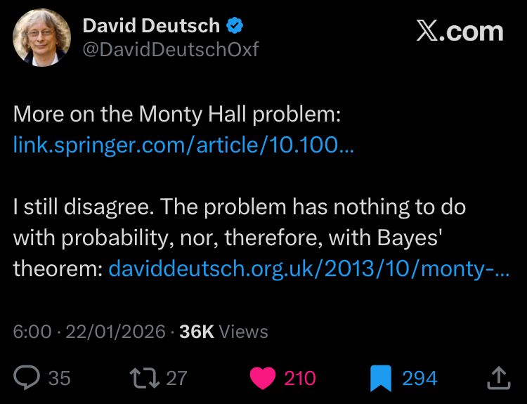 A few days after I’ve written this chapter on the Monty Hall problem, I saw the following post by David Deutsch on X: