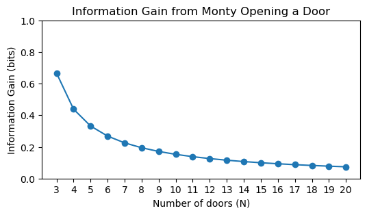 We learn from computing the posterior that it is equal to the prior after Monty opens door 2. That, of course, is not the whole story. The calculation of the information gain makes it explicit that the posterior is not a number, but a distribution. This is important to remember when we work with Bayesian statistics. Let’s state the first sentence in a more precise way: The probability that the car is behind door 1 remains unchanged, but the probabilities of the other doors change, and we learn something from that change. The more doors there are, the less informative is the revelation that door 2 has a goat behind it, as shown in the plot above.