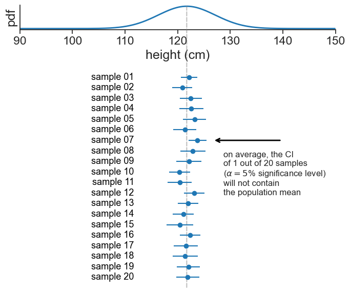 See the height distribution for seven-year-old boys. Below it we see the means for 20 samples of groups of 30 boys. The 95% confidence interval is the range of values that, on average, 95% of the samples CI contain the true population mean. In this case, this amounts to one out of the 20 samples.