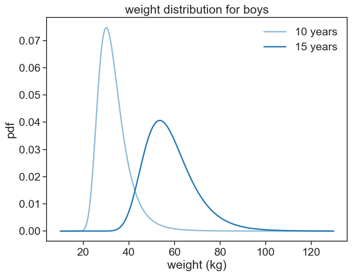 Let’s see the weight probability density for boys at age 10 and 15.