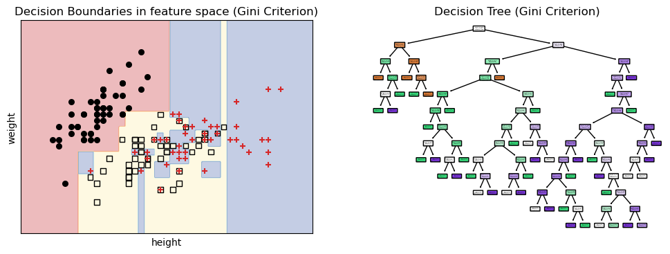 plot_decision_boundaries(ax[0], classifier_gini, X, y, "Decision Boundaries in feature space (Gini Criterion)")