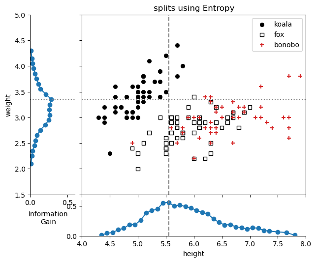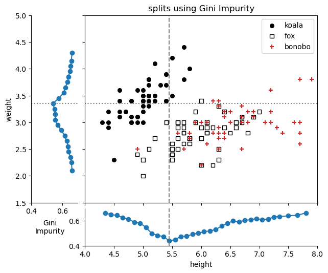 We will cut the data into two parts along one of the features. We will try all possible cut thresholds for each of the features and see which one gives us the best split. Ideally, we want to end up with two groups, “left” and “right”, that are as “pure” as possible, meaning that each group contains animals of only one species. It might not be possible to get perfect homogeneity, so we will need to quantify how good a split is. We will use two different metrics to evaluate the quality of a split:
