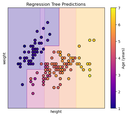 Each region (leaf) of the tree will predict the mean age of the training samples that fall into that region. Visualizing this in 3d shows us steps, because the regression tree creates a piecewise constant approximation of the target variable (age) over the feature space (height and weight).
