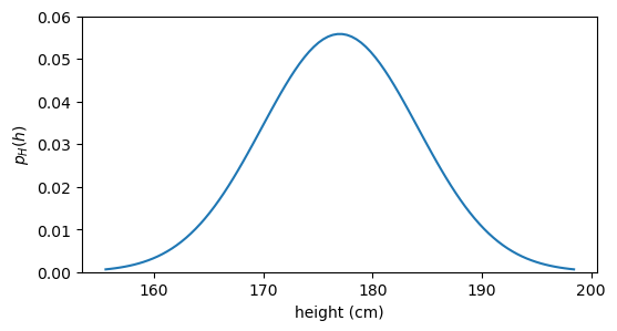 - Instead of a probability mass function (PMF), in the continuous case we have a probability density function (PDF), which we denote as p_H(h). The big difference is that, for a given realization in the discrete case, p_Z(z) gives us the probability that Z takes on that specific value. In the continuous case, p_H(h) does not give us the probability that H takes on the specific value h, because in a continuous distribution, the probability of any specific value is zero. What’s the probability that a given adult male has a height of exactly 175 cm? The answer is zero, because if we measure with infinite precision, we’ll never hit that exact value. Instead, p_H(h) gives us the density at that point, and we can use it to calculate probabilities over intervals. For example, the probability that H takes on a value between 170 cm and 180 cm is given by the integral of the PDF over that interval: P(170 < H < 180) = \int_{170}^{180} p_H(h) \, dh.