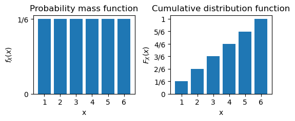 The panel on the left shows the PMF of X. The probability that each value in the support of X takes on is \frac{1}{6}. So all the bars have the same height.