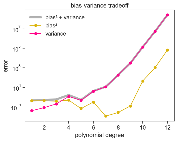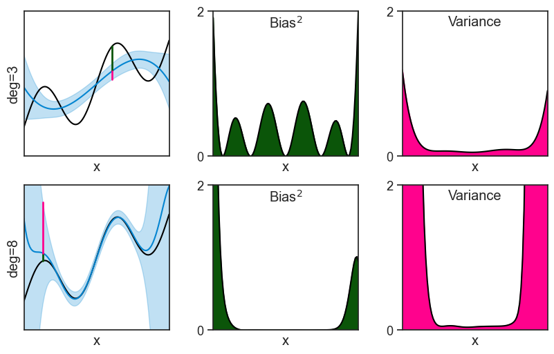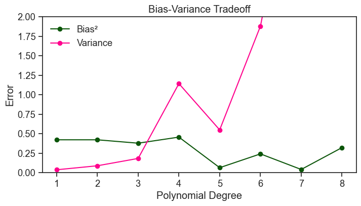 If our aim is to minimize the expected error, we should choose a polynomial degree that minimizes the sum of bias and variance. In the plot above, the sweet spot of the bias-variance tradeoff for this specific problem is around a degree of 7.