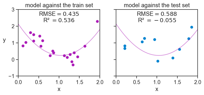 As expected, the model’s performance on the test data, as measured by the RMSE and R-squared, is worse than its performance on the training data: the RMSE went up, and the R-squared went down. By chance, we had the “luck” of getting a negative R-squared on the test data! How is that possible?! In very few words, this means that the model is worse that useless. The model does so badly on the test data, that we would have been better off just predicting the mean of the test data for all test points, instead of using the model’s predictions. More on this point on the chapter on R-squared.