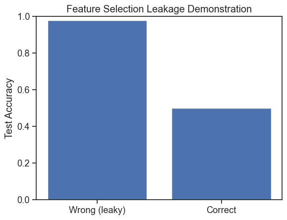 # ------------------------------------------------------------# feature selection leakage demonstration (gene example)# ------------------------------------------------------------import numpy as npimport matplotlib.pyplot as pltfrom sklearn.linear_model import LogisticRegressionfrom sklearn.metrics import accuracy_scorefrom sklearn.model_selection import train_test_split# -------------------------# 1. generate synthetic data# -------------------------np.random.seed(0)n_samples =120# number of patientsn_features =20000# number of genes (all noise!)# gene expression: pure noiseX = np.random.normal(size=(n_samples, n_features))# disease label: random (no relationship to genes)y = np.random.randint(0, 2, size=n_samples)# -------------------------# 2. WRONG approach: feature selection before splitting# -------------------------# compute correlation between each gene and the labelcorrelations = np.array([ np.corrcoef(X[:, j], y)[0, 1] for j inrange(n_features)])# select top 50 most correlated genes (using ALL data)top_k =50top_features_wrong = np.argsort(np.abs(correlations))[-top_k:]X_selected_wrong = X[:, top_features_wrong]# now split AFTER feature selection (this is the mistake)X_train_w, X_test_w, y_train_w, y_test_w = train_test_split( X_selected_wrong, y, test_size=0.4, random_state=42)model_wrong = LogisticRegression(max_iter=1000)model_wrong.fit(X_train_w, y_train_w)y_pred_w = model_wrong.predict(X_test_w)acc_wrong = accuracy_score(y_test_w, y_pred_w)print("WRONG pipeline (feature selection before split)")print(f"Test accuracy: {acc_wrong:.3f}")print()# -------------------------# 3. CORRECT approach: split first, then select features# -------------------------# split raw data firstX_train, X_test, y_train, y_test = train_test_split( X, y, test_size=0.4, random_state=42)# compute correlations ONLY on training datacorrelations_train = np.array([ np.corrcoef(X_train[:, j], y_train)[0, 1] for j inrange(n_features)])top_features_correct = np.argsort(np.abs(correlations_train))[-top_k:]X_train_c = X_train[:, top_features_correct]X_test_c = X_test[:, top_features_correct]model_correct = LogisticRegression(max_iter=1000)model_correct.fit(X_train_c, y_train)y_pred_c = model_correct.predict(X_test_c)acc_correct = accuracy_score(y_test, y_pred_c)print("CORRECT pipeline (split before feature selection)")print(f"Test accuracy: {acc_correct:.3f}")print()# -------------------------# 4. visualize comparison# -------------------------plt.figure()plt.bar(["Wrong (leaky)", "Correct"], [acc_wrong, acc_correct])plt.ylabel("Test Accuracy")plt.title("Feature Selection Leakage Demonstration")plt.ylim(0, 1)plt.show()