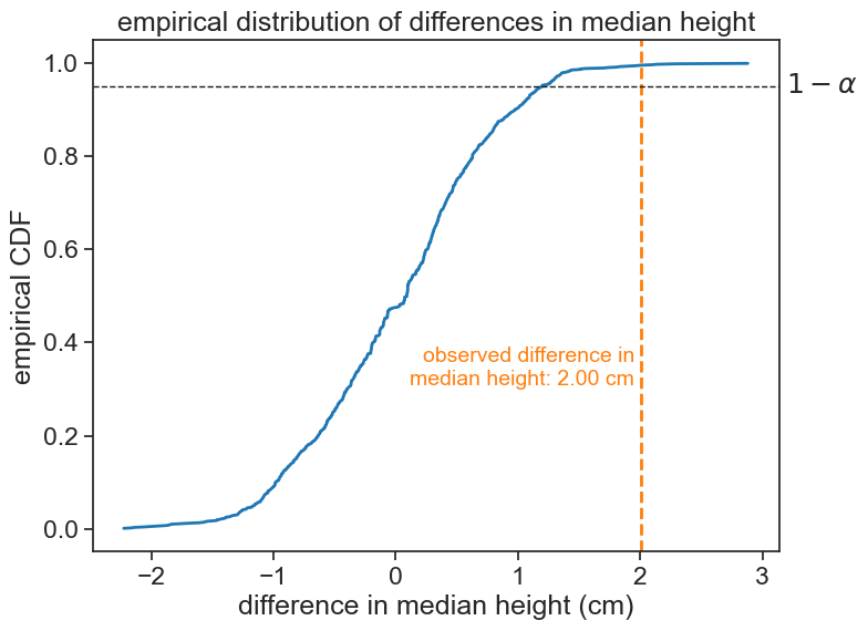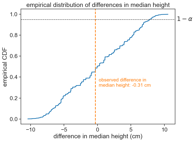 print(f"median difference (girls minus boys): {observed_diff:.2f} cm")median height for girls: 150.88 cm