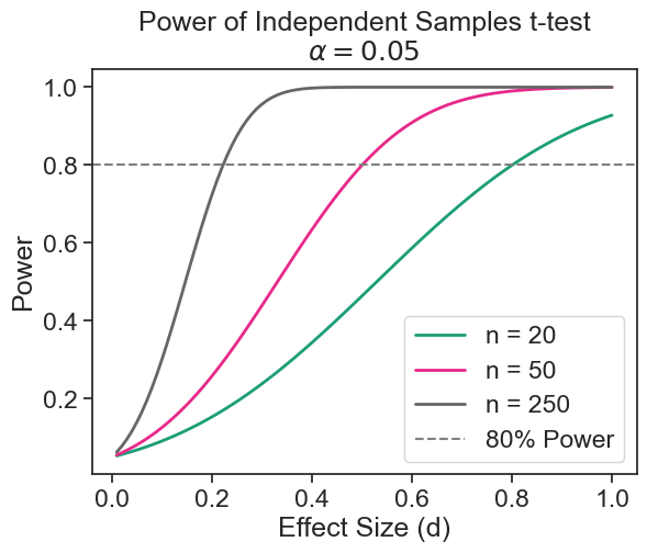 ax.legend(['n = 20', 'n = 50', 'n = 250', '80% Power'])
