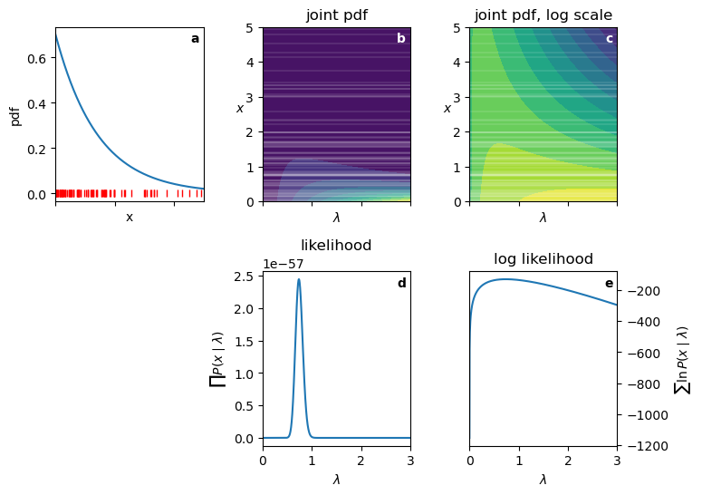 - Panel d: likelihood as a function of \lambda for the observed data. How to read this: for each value of \lambda on the x-axis, look up to see where it intersects each of the horizontal white lines in panel b, read off the corresponding probability density values, and multiply them together to get the likelihood value at that \lambda. Note the following: