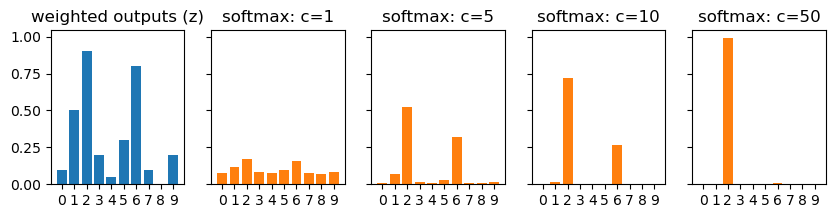ax[i+1].bar(range(10), softmax(z, c=c_list[i]), color='tab:orange')