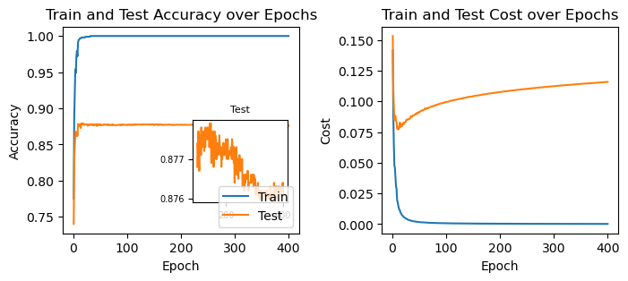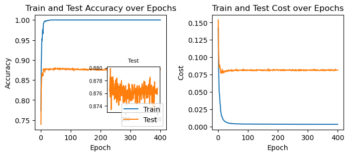 ax[1].set_title("Train and Test Cost over Epochs");
