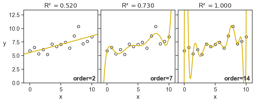 This time I don’t have such good feelings as I see the value of R-squared increasing. For the panel on the right, it doesn’t look anymore like to points are hugging the fitted curve, but rather the fitted curve is contorting itself to hug the points.
