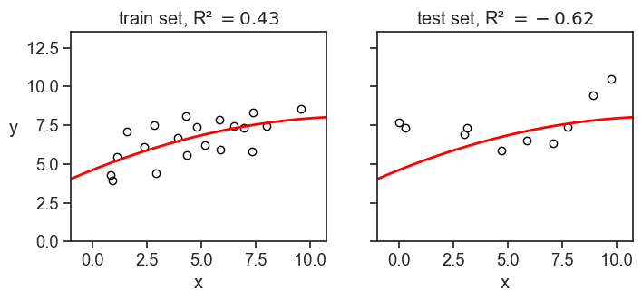 In the example above, we divided the dataset of 30 points into 20 training points and 10 test points. We fitted a parabola to the training data, and then evaluated the R-squared on both the training and test data. I had to play a little bit with the random seed to get a negative R-squared on the test set, but it is not that hard to get it.