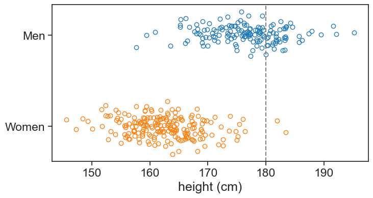ax.plot(sample_girls, 0 + rng.normal(scale=0.1, size=N_girls), 'o', label='Girls', mfc='None', mec="tab:orange")