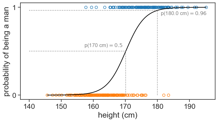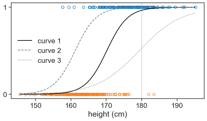 print(f"curve 3: P(man | h=180 cm) = {logistic_function(180, beta0+23, beta1*0.5):.2f}")curve 1: P(man | h=180 cm) = 0.96