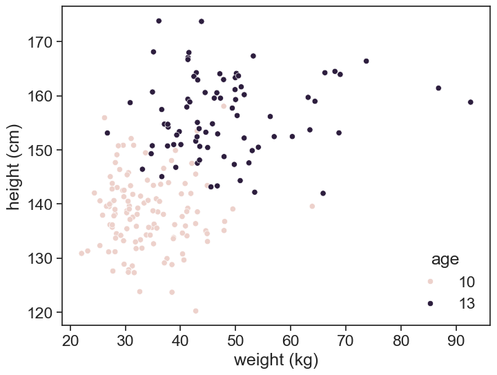sns.scatterplot(data=df, x='weight', y='height', hue='age', ax=ax)