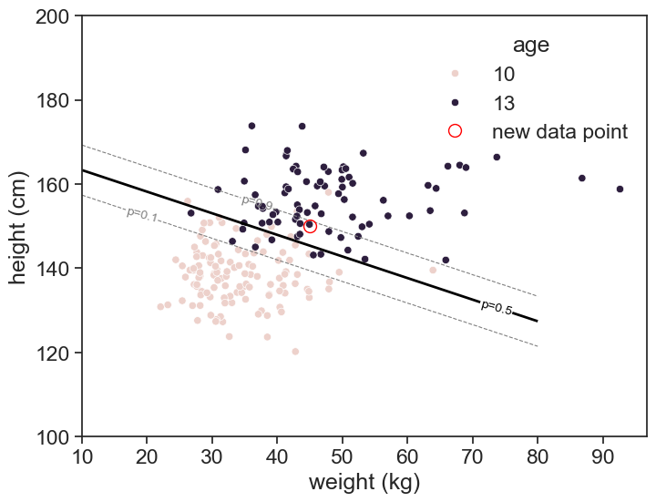 The thick line in the figure above is the decision boundary, where the probability of being 13 years old is 0.5. The equation of the line is